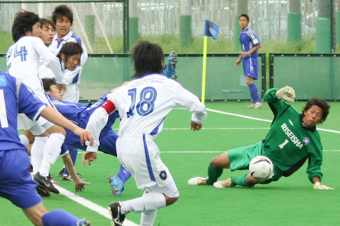 前半、双方ともにペースを掴めない。5分、阪南大クラブ No.8 MF 岸本のコーナーキックによるチャンスが訪れるが得点にできず。