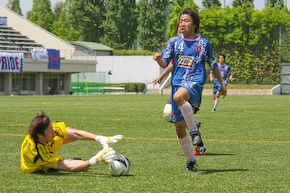 拮抗するパワーに、一進一退の展開。前半、奈良クラブは5本、アイン食品は6本のシュート数がそれを物語るが、0-0のまま後半に流れ込んだ。