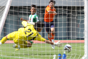 28分、アミティエに再びFKのチャンス。篠原が放つボールを塚原がゴール左奥に押し込み待望の先制点。